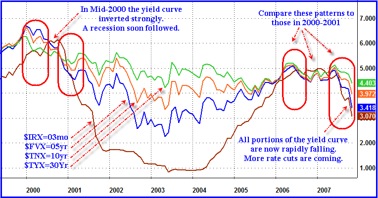 Note the strong similarity between the yield curve in 2000-2001 and 2006-2007. The yield curve itself suggests we are already in a recession regardless of what the GDP says. One thing is certain: The treasury market is expecting more rate cuts.