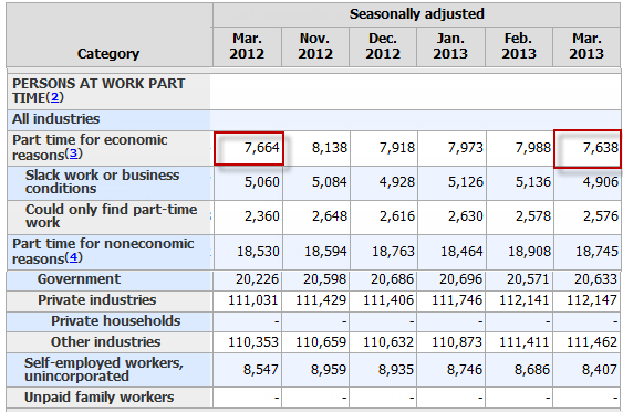 There are 7,638,000 workers who are working part-time but want full-time work. A year ago there were 7,664,000. There has been no improvement in a year. This is a volatile series.