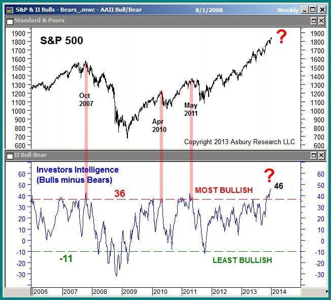 One of the dozen or so data series that we track, the Investors Intelligence data, was particularly interesting this past week because the Bulls minus Bears subset of this series (blue line, lower panel of chart below) rose to an historic most bullish extreme that hasn’t been seen since February 1987.